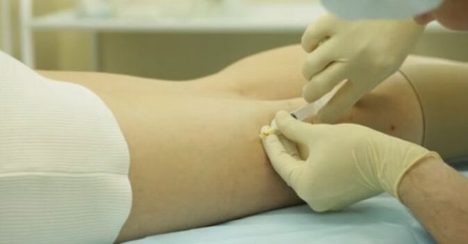 - Anschließend wird die Exzision der Fässer von Krampfadern unter Verwendung chirurgischer Ausrüstung (Spezialsonde) durchgeführt.